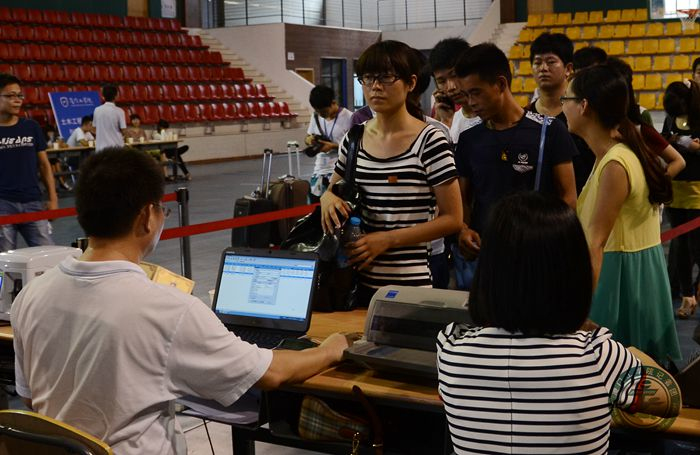 考虑到天气因素,今年的新生迎新工作进行了部分调整。新生在体育馆集中办理缴费等手续,各院系迎新报到环节则改到各个院系单独组织进行IC卡学生证和落户注册。14级新生入学接待工作进展的如火如荼,各街道挤满了从各方赶赴而来的学子、家长,来来往往的工作人员井然有序的工作着。