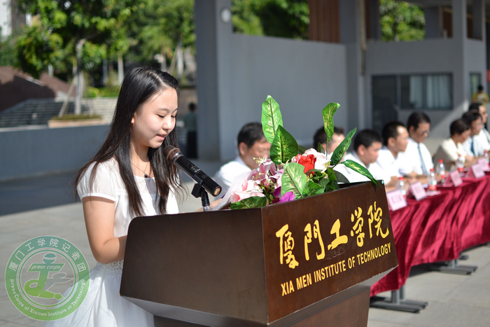 在校生代表徐子钦在致辞中代表全体在校生对2014级新生的到来表示欢迎。她表示大学有许多困难和挑战,而军训就是第一项挑战。她希望全体新生都能坚持到军训的最后,也相信全体新生都能园满完成军训任务。
