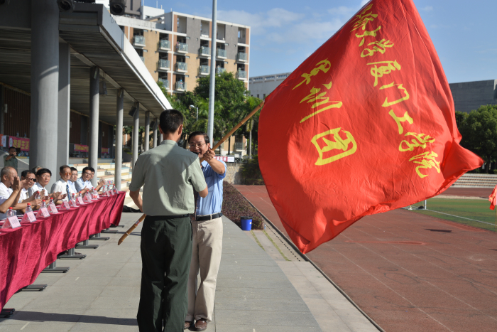 动员大会在升国旗仪式中拉开序幕,伴随着中华人民共和国国歌,五星红旗在我校操场冉冉升起。升旗仪式结束后,校长蔡远利教授向军训团魏海泉团长授予了2014级厦门工学院军训团团旗。