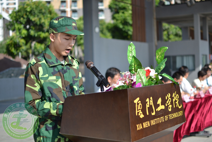 新生代表张国伟在致辞中表示军训中所需要的意志和精神正是大学新生所缺少的,他代表全体新生郑重承诺一切听从指挥,服从军训营领导和教官的管理。