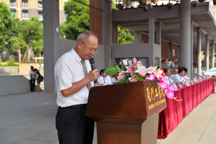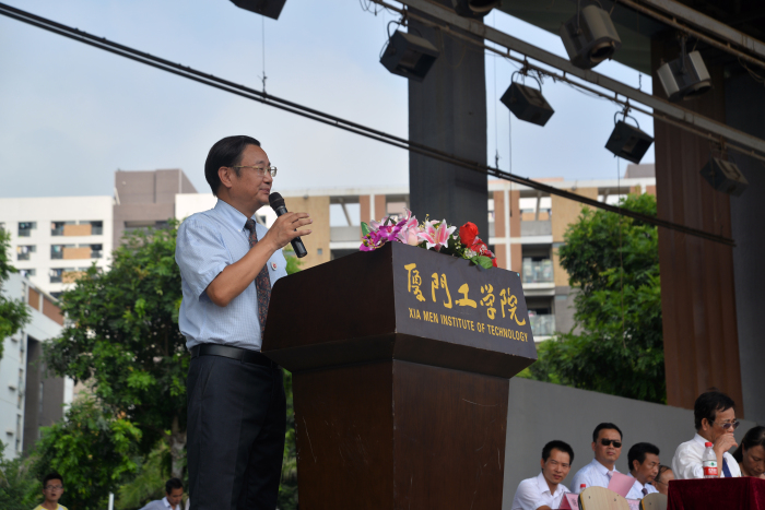 董事长李德文先生,华侨大学副校长、厦门工学院党委书记吴季怀教授,执行董事李雄虎先生,校长蔡远利教授,副校长兼党委常务副书记陈克明教授、副校长田晓皋教授以及各部门负责人、全体教职员工、在校学生代表以及2014级全体新生、部队官兵出席了此次典礼。典礼由校长助理
