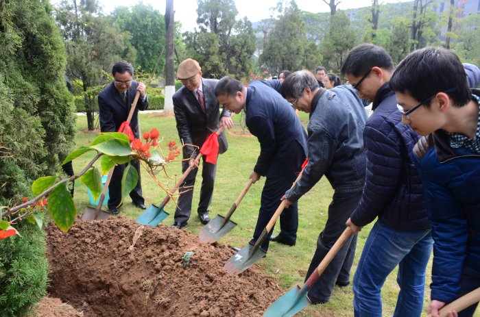 表彰大会结束后,学院的董事会领导,学校领导及教师学生代表一起移步百树园进行植树活动。相较于往年爱生节的阴雨天气,今年晴朗的天气也让大家参与活动的心情更加愉悦。董事长李德文先生,执行董事李雄虎先生,副校长田晓皋教授携教师代表及学生代表共同执锹培土,种植一棵柏树。