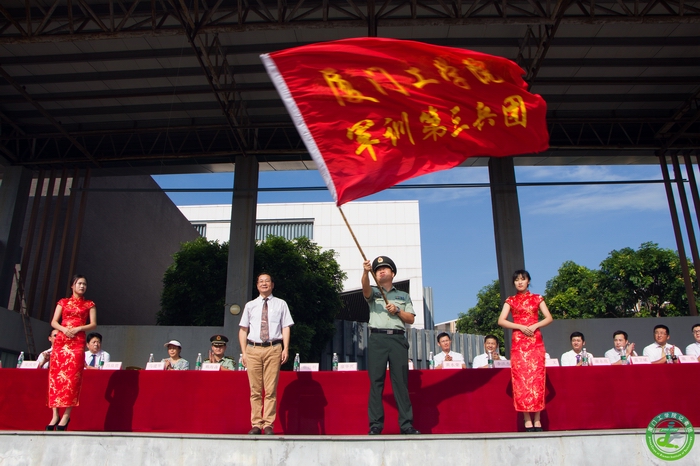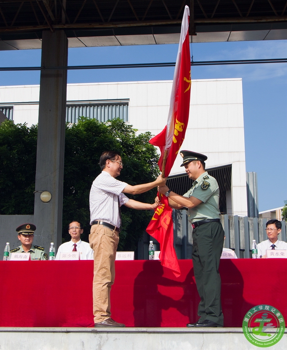 蔡远利校长向军训团廖华兴团长授厦门工学院2015级军训团团旗