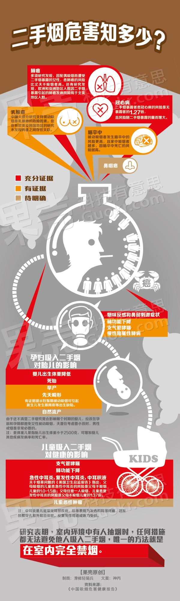 二手烟有着刺鼻的气味,这是其中含有的吡啶所产生的,但更重要的是,它同样含有烟草燃烧所产生的各类有害物质。和直接吸烟一样,二手烟也可导致包括肺癌、冠心病和慢性阻塞性肺病等严重的心血管病和呼吸道疾病。孕妇暴露于二手烟雾除了会影响自身健康外,还会增加死胎、先天畸形儿以及低出生体重儿等风险。