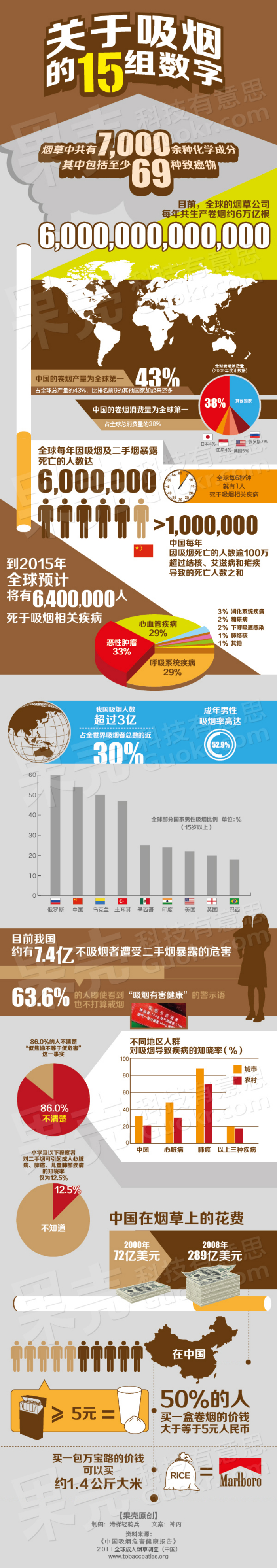 烟草危害是当今世界最严重的公共卫生问题之一,全球每年因吸烟导致的死亡人数高达600万,超过因艾滋病、结核、疟疾导致的死亡人数之和。我国是世界上最大的烟草生产国和消费国,吸烟对人民群众健康的影响尤为严重。据调查,我国吸烟人群逾3亿,另有约7.4亿不吸烟人群遭受二手烟的危害;每年因吸烟相关疾病所致的死亡人数超过100万,如对吸烟流行状况不加以控制,至2050年每年死亡人数将突破300万,成为人民群众生命健康与社会经济发展所不堪承受之重。