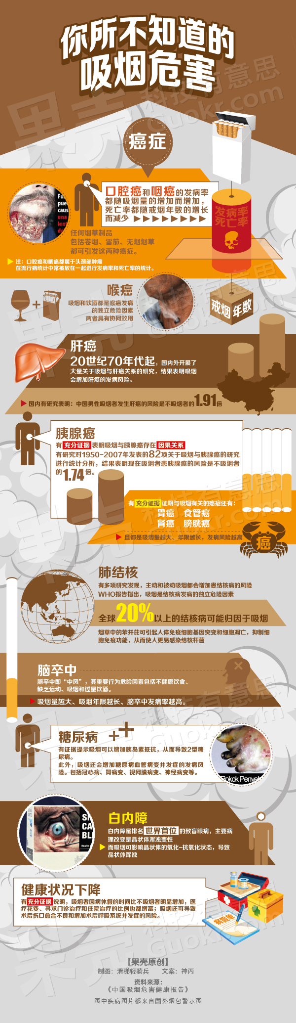 尽管谁都会说“吸烟有害健康”,但我国男性吸烟率依旧居高不下,女性吸烟率也正逐年上升。而民众对二手烟有害的知晓程度也不容乐观,很多人依旧持有“只要我自己不吸烟,就能够远离烟草危害”的错误观点。2010年的调查显示,我国仅有一半的被调查者知道二手烟能够对肺部健康造成损害;仅有不到三成的人群了解二手烟可引起成人心脏病。二手烟危害知晓率在教育程度比较低的人群中尤其低,例如小学及以下程度者对二手烟可引起成人心脏病、肺癌、儿童肺部疾病的知晓率仅为12.5%。