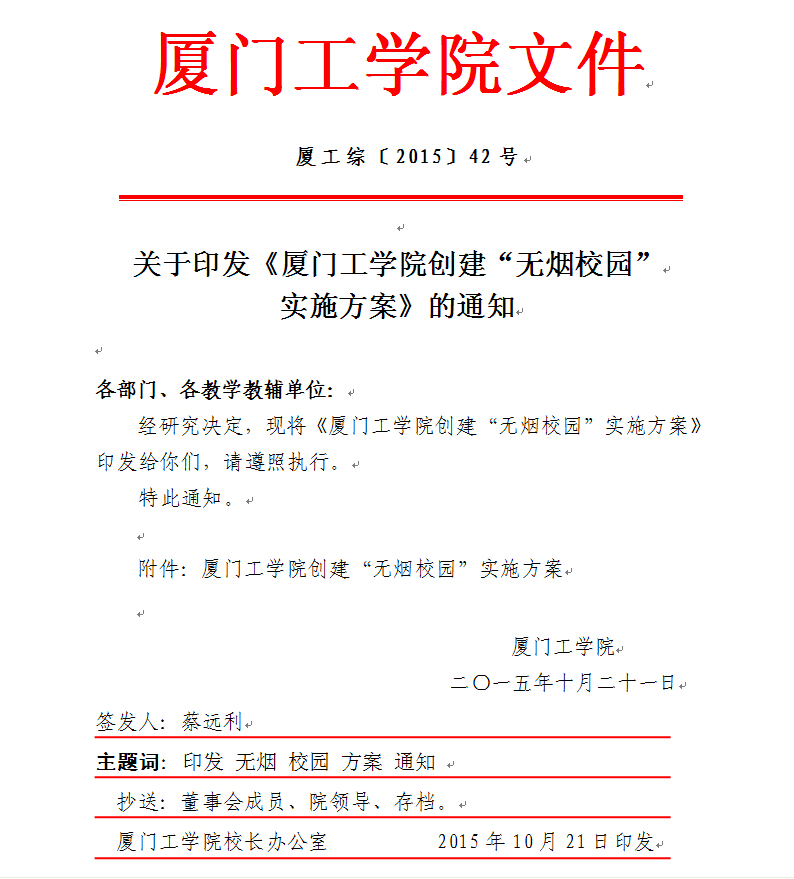 据悉,厦门工学院创建“无烟校园”,全面开展禁烟控烟工作是对《教育部关于在全国各级各类学校禁烟有关事项的通知》、教育部办公厅、卫生部办公厅《关于进一步加强学校控烟工作的意见》的具体落实。前期学校已经通过校园网、微信、微博等平台从身心健康、安全法制、道德文明三个角度对禁烟控烟活动进行宣讲和倡议,并对学校校园禁烟规定进行宣传和普及。(宣传处)