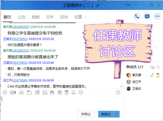 机械工程系《工程图学A(二)》的所有任课老师为了保证该课程的教学效果,采取了“课前线上预习-课中QQ直播重难点答疑、讲解测验题和作业-课后作业巩固”的教学方式,同时采用了精品课程录制视频作为该课程的教学视频。每一节课老师都会及时发布相应的教学视频、PPT、课堂测验和作业内容,以保证学生都能够更好的跟上老师的教学进度。为了能够更好的完成线上教学,任课教师之间还会互相讨论并改善各自的教学方式。