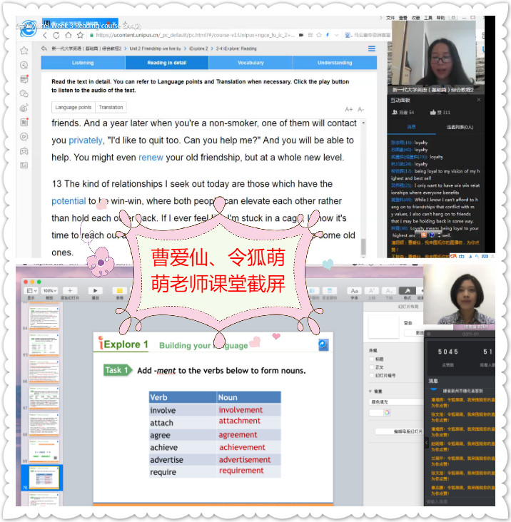 以下分别是曹爱仙老师和令狐萌萌老师的课堂教学截屏,颜丽娟、王碧荣、沈姝等老师的学生作业。