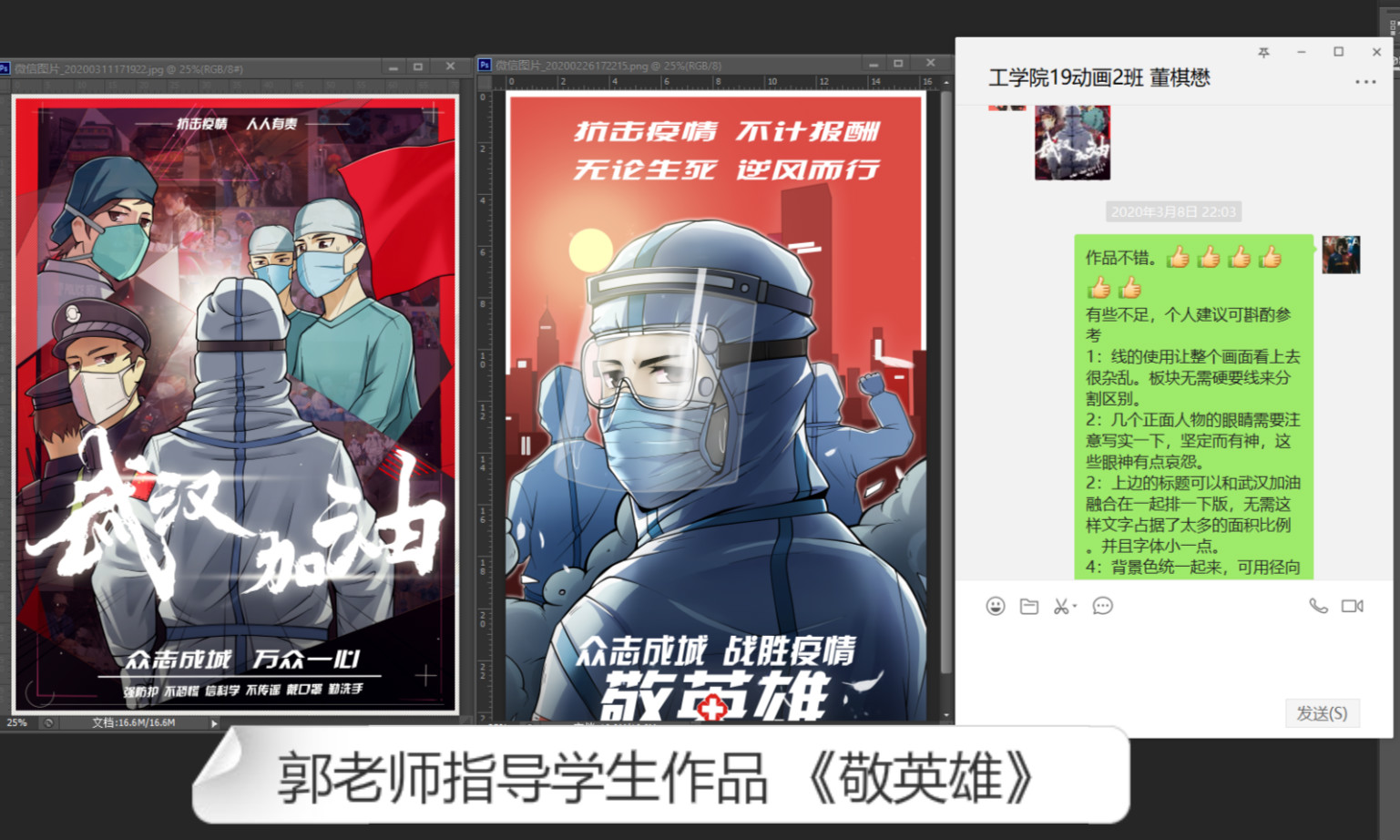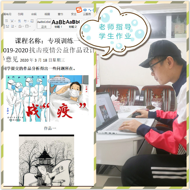 艺术学院郭长见老师所授的课程《专项训练一》是一门动画实操类专业课。郭老师在该门课程中采用中国大学慕课的课程资源结合微信群进行教学,主要的教学方式为通过慕课程序监控学生学习视频教程的状况,紧扣战“疫”主题,现场布置周期性主题作品设计——“2020抗击疫情公益作品设计大赛”,在线进行专业辅导和答疑。整体的教学效果较好,达到了预定的教学目标。