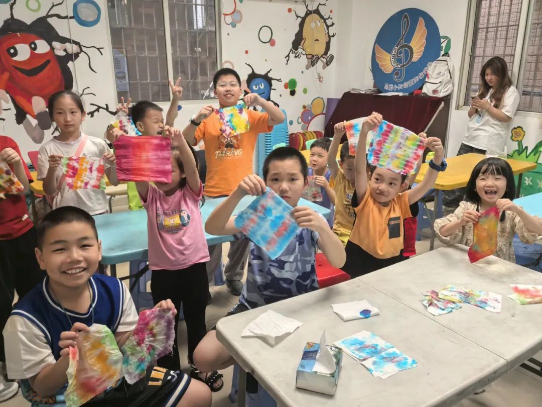 曾经,义教活动的内容较为单一,主要集中在科学实验等方面。厦工青协研学部对此进行大胆创新,除了有趣的物理小实验外,又新增了手工、非遗扎染、书法体验等多元活动。在浒井公益图书馆的扎染课上,孩子们浸染出五彩斑斓的图案,感受白族传统工艺的魅力;在李林公益图书馆的“瓶子吹气球”实验中,化学魔法让孩子们惊叹不已,他们主动探究科学原理。浒井图书馆的留守儿童诗雨,在扎染课上学会“螺旋扎法”后,主动帮新手弟弟妹妹调整棉线松紧。当看到自己染出的蓝白晕染图案被馆长挂在展示墙时,她仰着头对志愿者说:“原来我也能做好一件这么厉害的事!”