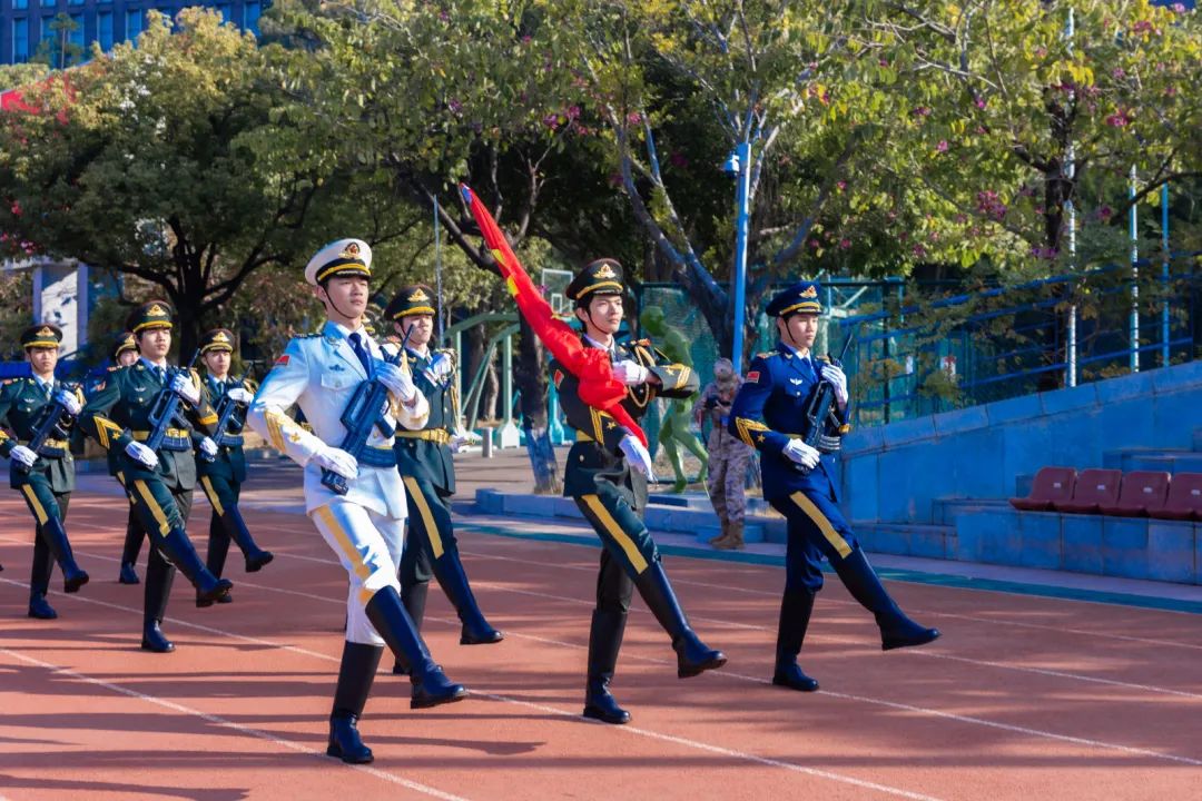 国旗护卫队是校园中一道庄严而亮丽的风景线,日常管理采取半军事化训练模式,队员们经过严格的选拔和艰苦的训练,具备坚定的意志、挺拔的身姿和规范的动作。根据工作职责设有作训部、宣传部、生活部和“退役军人服务驿站”。除了日常升旗,协助学校重大活动的秩序维护工作,他们还积极参与校园爱国主义教育活动,传播国旗文化,开展征兵宣传、“爱我国防”演讲比赛等活动,激发同学们的爱国热情,厚植新时代青年爱国情怀。