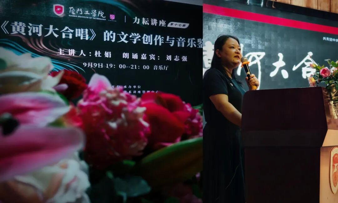 “朋友,你到过黄河吗?你渡过黄河吗?”2025年9月9日晚,慷慨激昂的朗诵声伴随着动人的钢琴旋律,响彻厦门工学院音乐厅。在以“《黄河大合唱》的文学创作与音乐鉴赏”为主题的第十七期力耘讲座现场,全场师生正聚精会神地聆听,在音乐与文学的交融中感受爱国情怀的无声浸润。