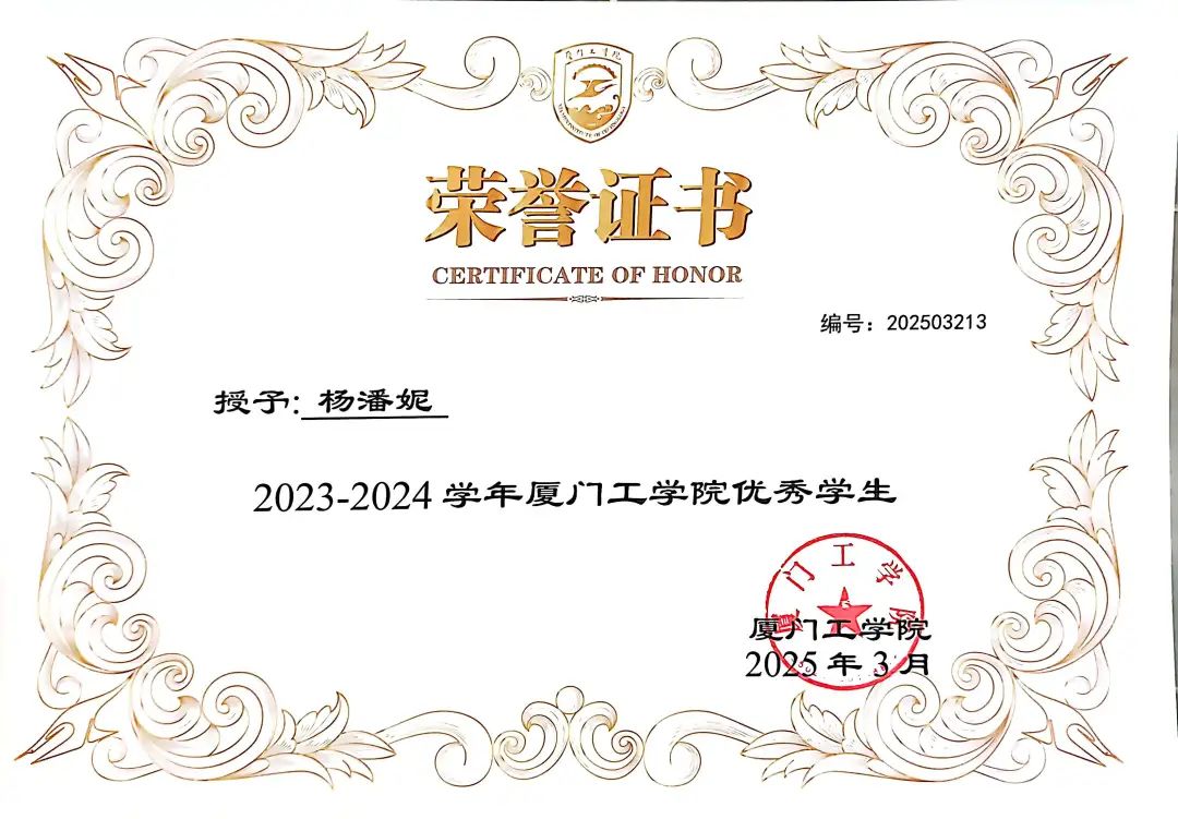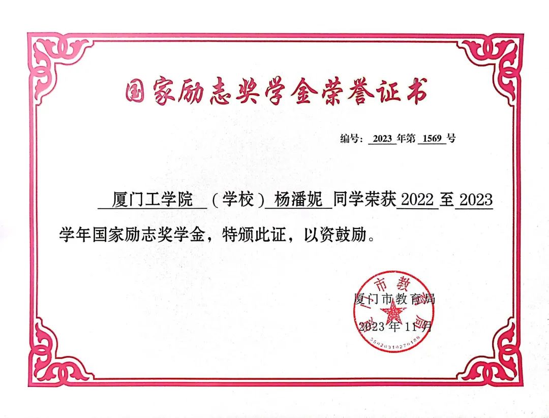 临近毕业,打开杨潘妮的“大学荣誉仓”,或许有些让人目不暇接。国家奖学金、国家励志奖学金、厦门工学院“自律之星”、厦门工学院“最美学生”……累计获得4项国家级、17项省级、24项校级竞赛奖项。