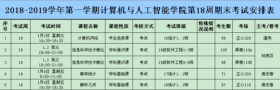 2018-2019学年第一学期学院期末考试安排(第18周)