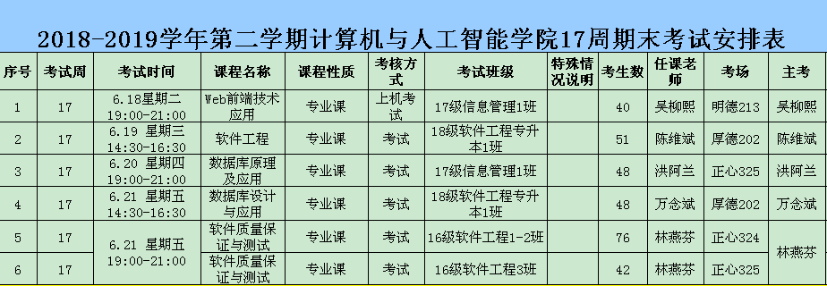 计算机与人工智能学院2018-2019学年第二学期期末考试安排表(第17周)