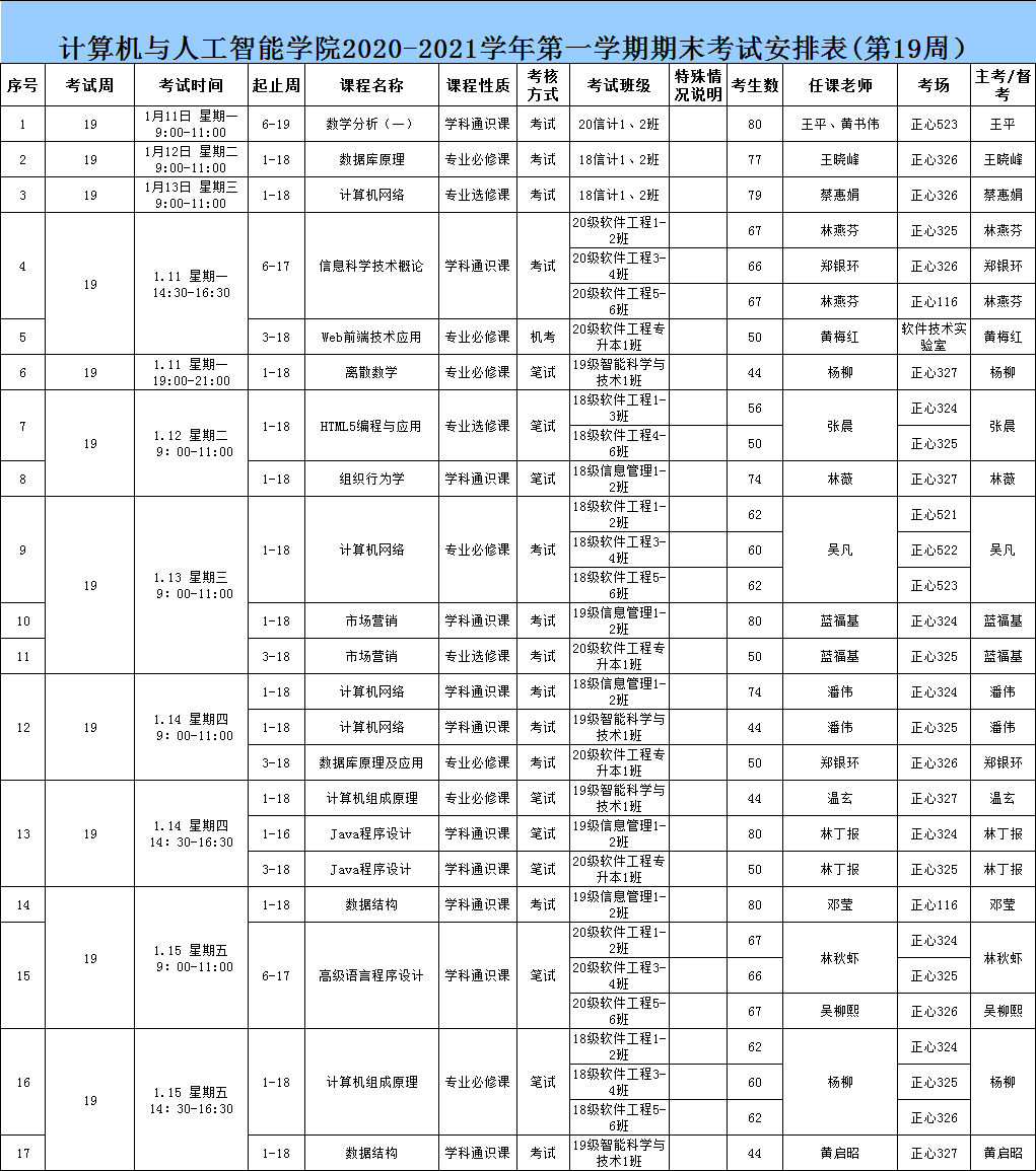 计算机与人工智能学院2020-2021学年第一学期期末考试安排表(第19周)