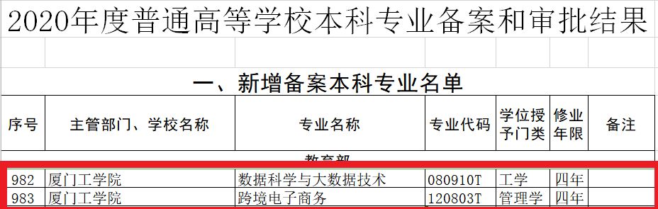 近日,中华人民共和国教育部下发《教育部关于公布2020年度普通高等学校本科专业备案和审批结果的通知》(教高函〔2021〕1号),公布2020年度普通高等学校本科专业备案和审批结果,厦门工学院“跨境电子商务”和“数据科学与大数据技术”专业荣获审批,并于2021年9月开始招生!欢迎广大考生报考!