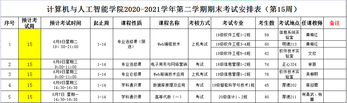 (第15周)2020-2021学年第二学期专业课期末考试安排表