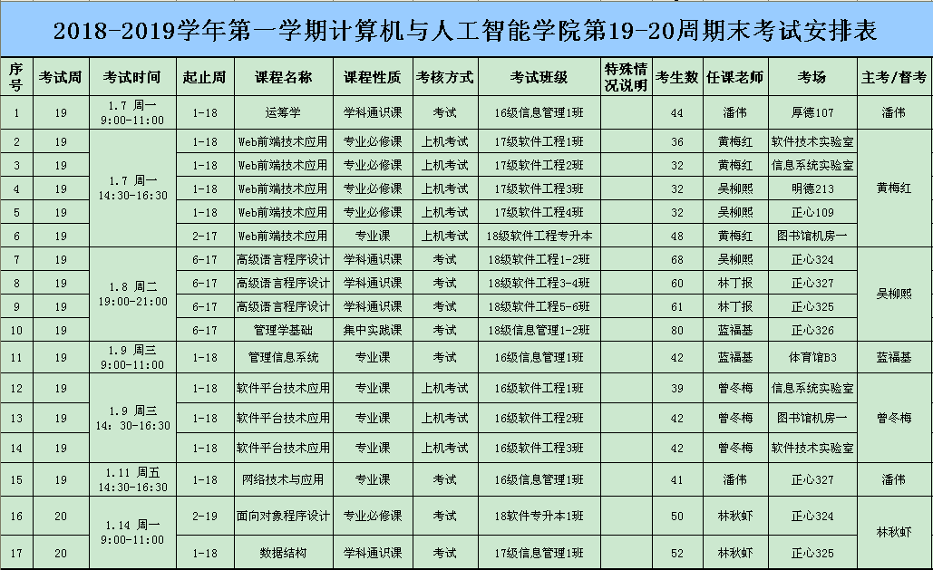 2018-2019学年第一学期学院期末考试安排(第19-20周)