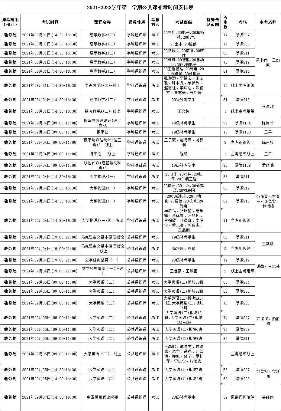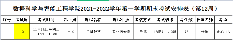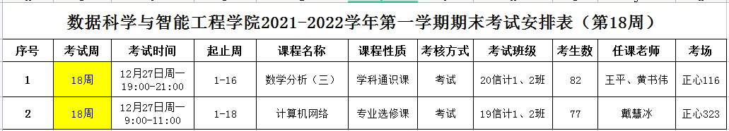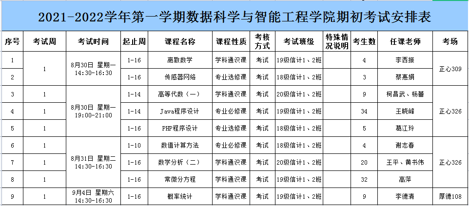 2021-2022学年第一学期数据科学与智能工程学院期初考试安排表