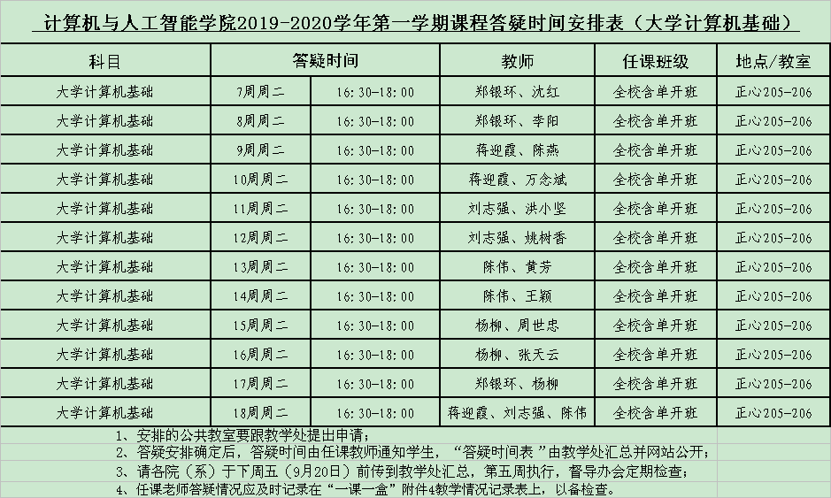全校公共课(大学计算机基础)2019-2020学年第一学期程答疑安排表