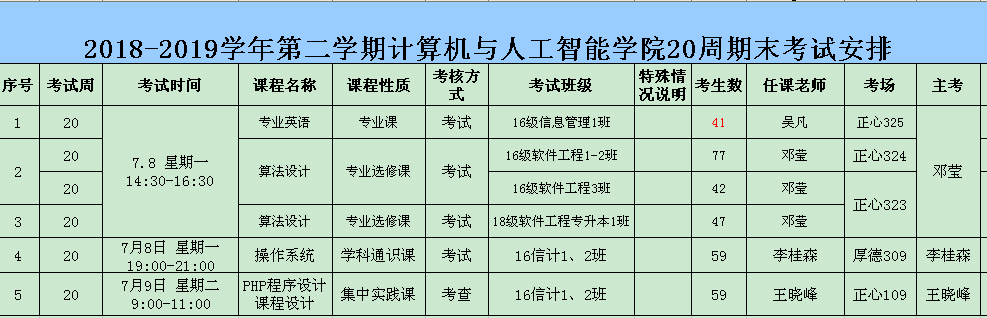 计算机与人工智能学院2018-2019学年第二学期期末考试安排表(第20周)