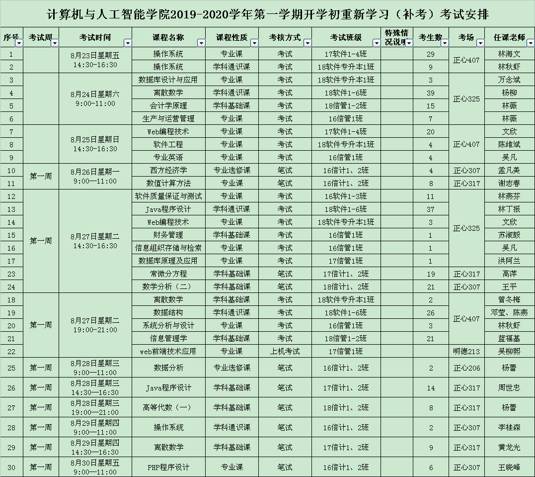 计算机与人工智能学院2019-2020学年第一学期开学初专业课重新学习(补考)考试安排