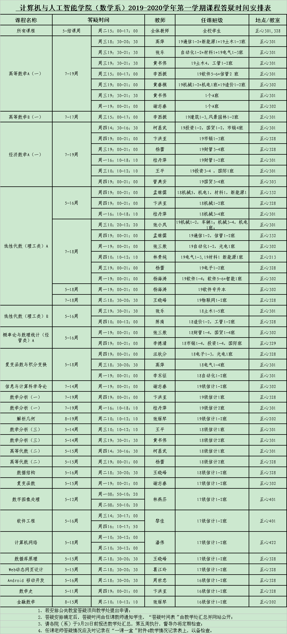 计算机系2019-2020学年第一学期专业课答疑安排表