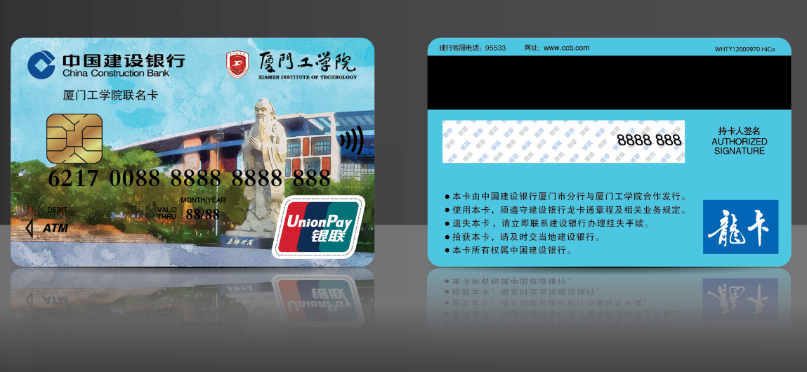 学校为每名新生申办了建设银行——“厦门工学院联名卡”(以下简称银行卡),该银行卡是按照学生姓名、身份证号等学生信息一对一制作的,是学校指定使用的银行卡。该卡将随录取通知书一同寄送(若未收到卡,可到学校后补办)。在校期间学生各类奖、助学金及补贴的发放将直接存入此卡中,校园卡圈存可直接从该卡圈存转入。请务必妥善保管好此银行卡,以便在校期间使用。