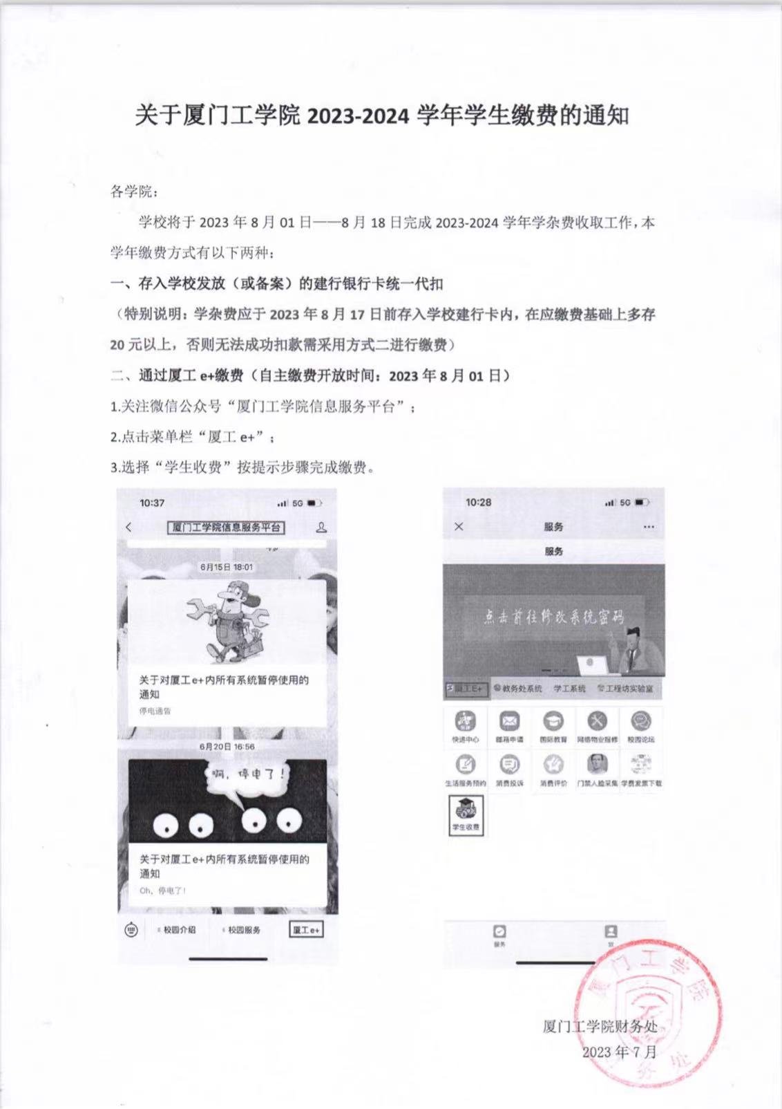 【校内】关于厦门工学院2023-2024学年老生缴费的通知