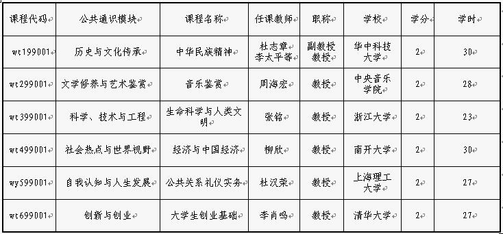 (课程代码以w开头的为网络课程) 课程代码 课程中文名 课程归属 学分 总学时 周学时 xt399001 逻辑学与智慧 科学、技术与工程 2 32 2 79910020 技术经济学 科学、技术与工程 2 30 3 xt199001 人文通识导论 历史与文化传承 2 32 2 79910015 英国文化赏析 历史与文化传承 2 36 2 xt499001 闽台关系史 社会热点与世界视野 2 32 2 xt499002 西方文化概论 社会热点与世界视野 2 32 2 64101004 演讲与口才 社会热点与世界视野 2 32 2 xt299001 动画概论 文学修养与艺术鉴赏 2 36 2 xt299002 音乐理论基础 文学修养与艺术鉴赏 2 32 2 xt299003 中国古典诗歌与人生 文学修养与艺术鉴赏 2 32 2 79910013 京剧艺术品鉴 文学修养与艺术鉴赏 2 32 2 79910012 情商 自我认知与人生发展 2 32 2 79910010 大学生心理健康教育 自我认知与人生发展 2 26 2 wt199001 中华民族精神 历史与文化传承 2 30 wt299001 音乐鉴赏 文学修养与艺术鉴赏 2 28 wt399001 生命科学与人类文明 科学、技术与工程 2 23 wt499001 经济与中国经济 社会热点与世界视野 2 30 wt599001 公共关系礼仪实务 自我认知与人生发展 2 27 wt699001 大学生创业基础 创新与创业 2 27