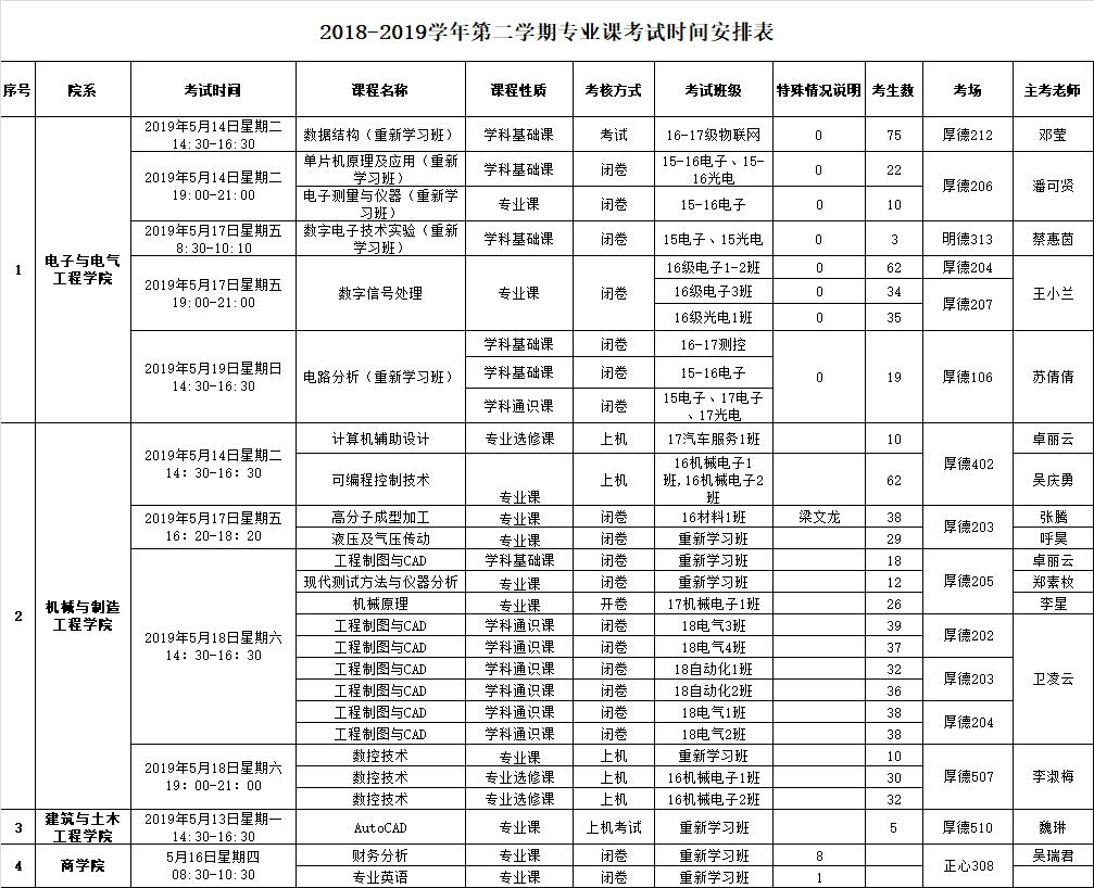 2018-2019学年第二学期第十二周专业课考试时间安排表