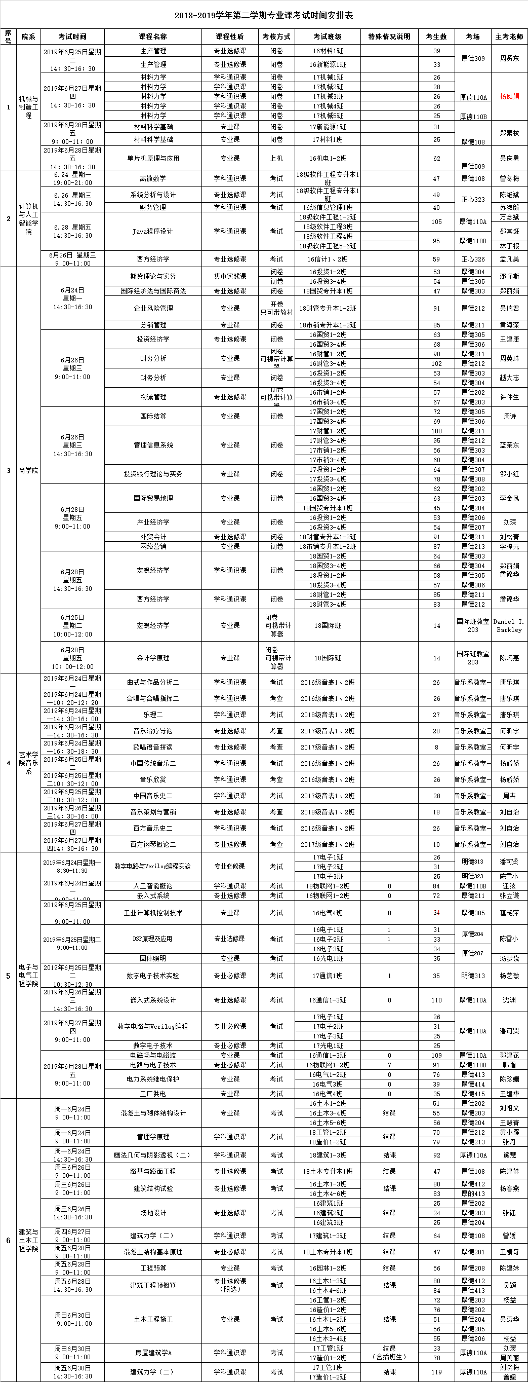 2018-2019学年第二学期第十八周专业课考试时间安排表