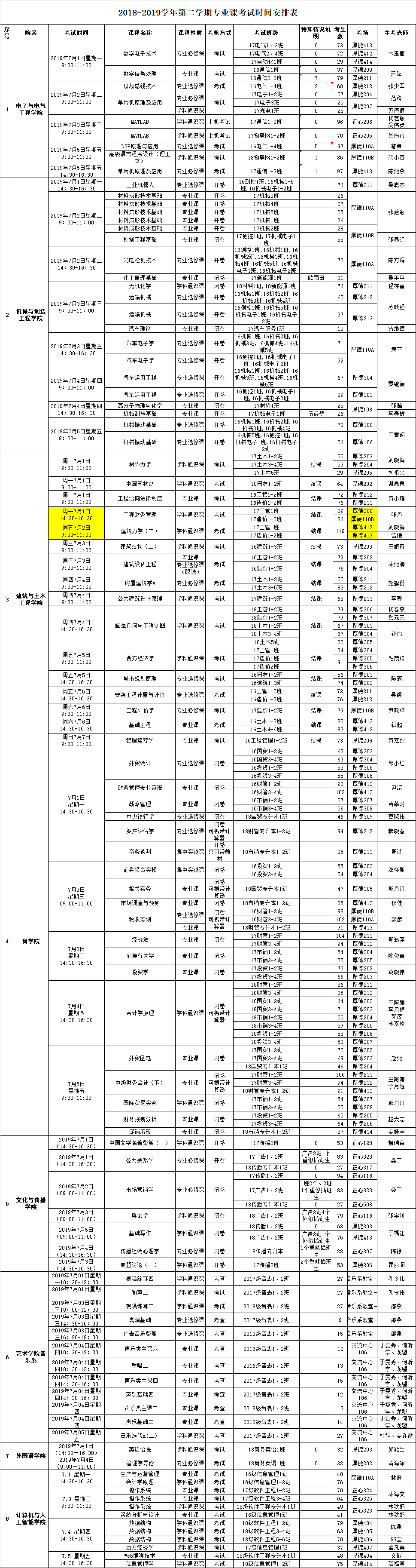2018-2019学年第二学期第十九周专业课考试时间安排表