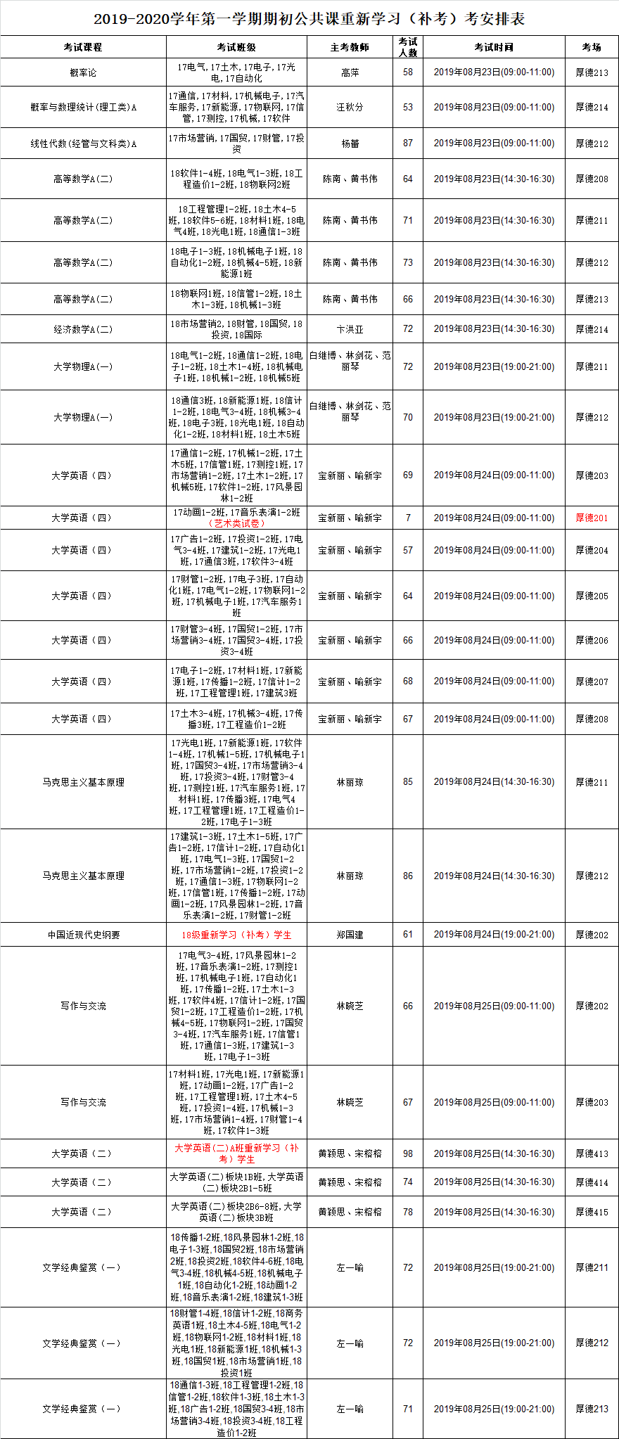 2019-2020学年第一学期期初公共课重新学习(补考)考安排表