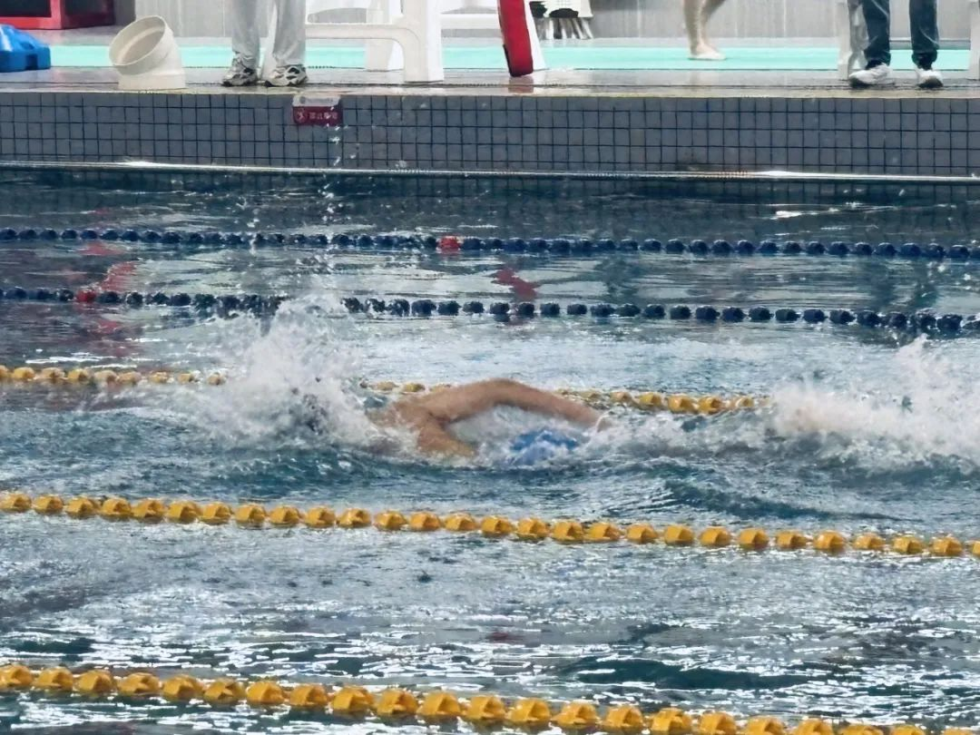 随着发令枪响,选手们如飞鱼般跃入水中,身姿矫健,泳池瞬间激荡起无数浪花。他们的划臂和蹬腿动作充满力量与节奏,在冲刺阶段,爆发出惊人的速度,赢得观众欢呼。他们顽强拼搏的奋斗精神和永不气馁的体育精神充分诠释了青年风貌。