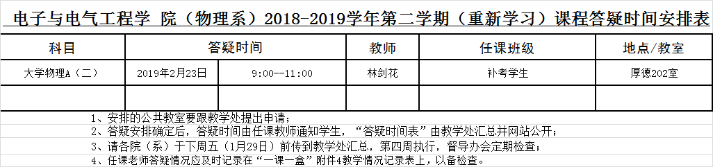 2018-2019学年第二学期<大学物理>课程答疑时间安排表