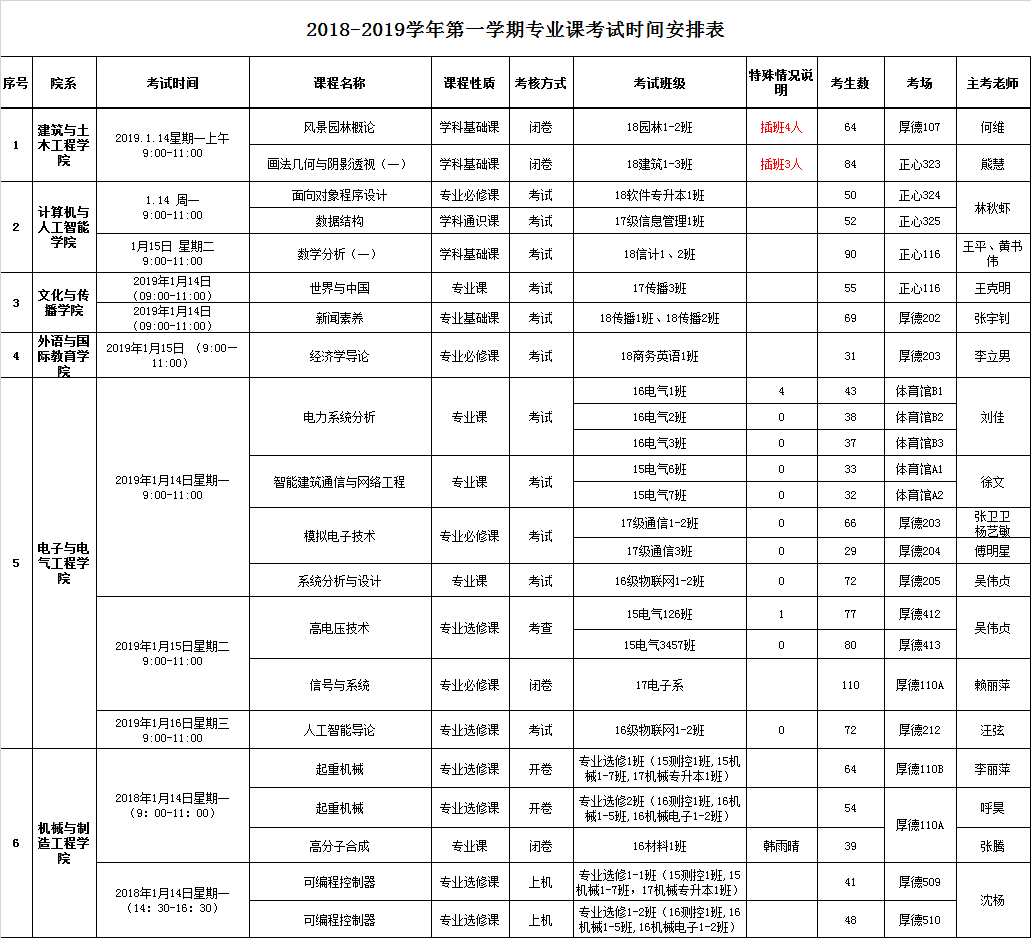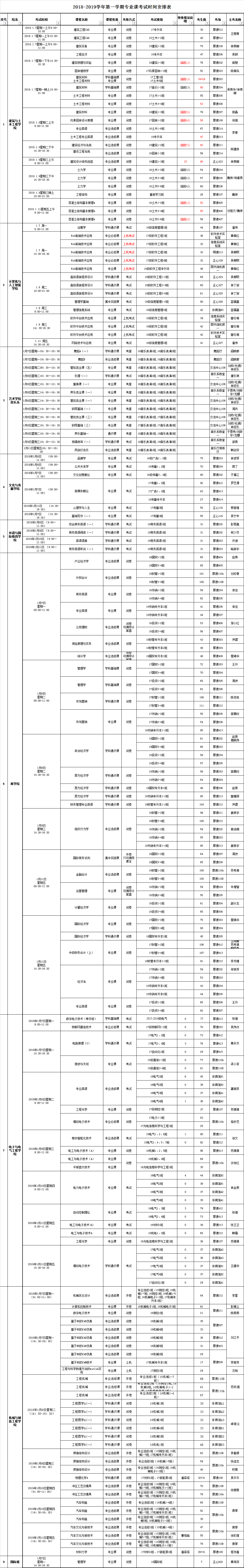 2018-2019学年第一学期第十九周专业课考试时间安排表