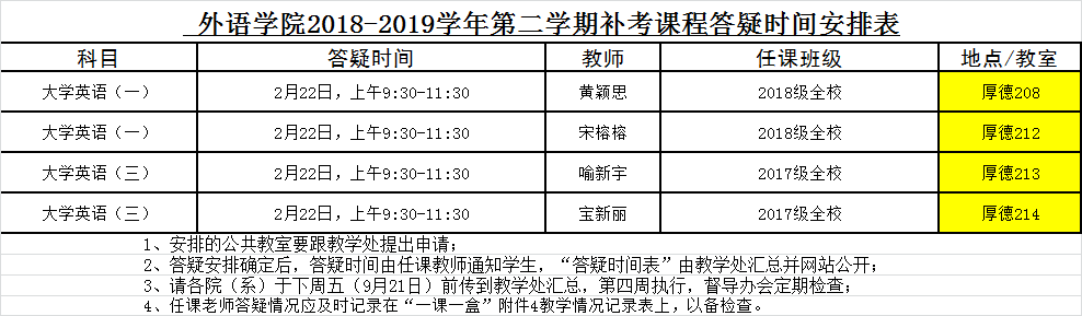2018-2019学年第二学期<外语与国际教育学院>课程答疑时间安排表