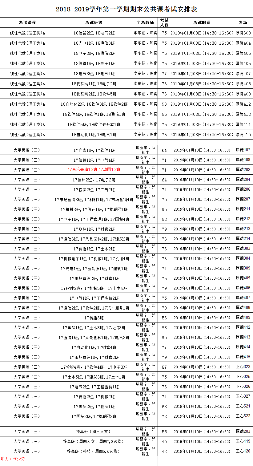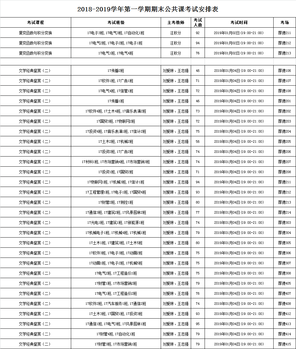 2018-2019学年第一学期第十七周专业课考试时间安排表