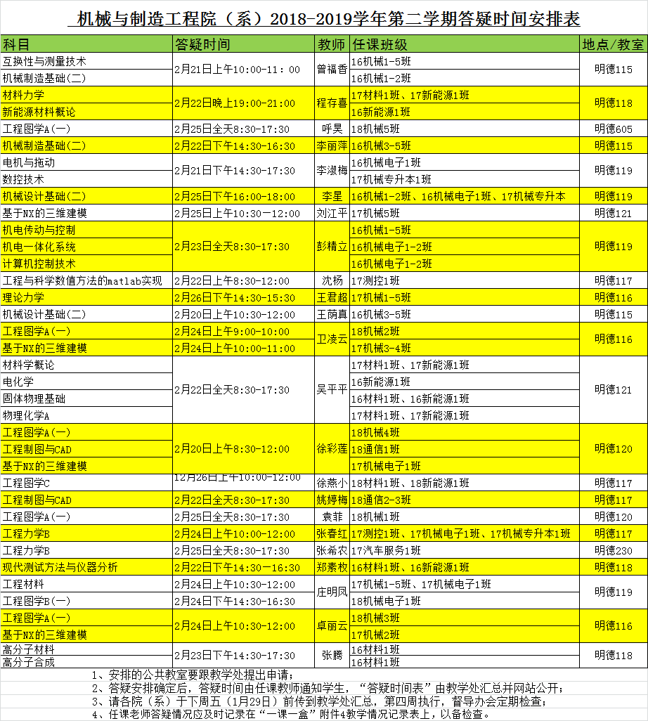 2018-2019学年第二学期<机械与制造工程学院>课程答疑时间安排表