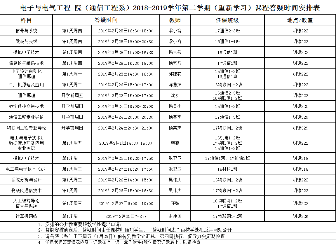 2018-2019学年第二学期<通信系>课程答疑时间安排表