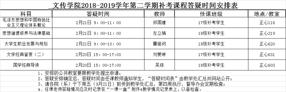 2018-2019学年第二学期<文化与传播学院>课程答疑时间安排表