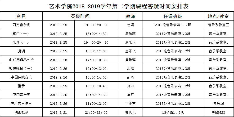 2018-2019学年第二学期<艺术学院>课程答疑时间安排表