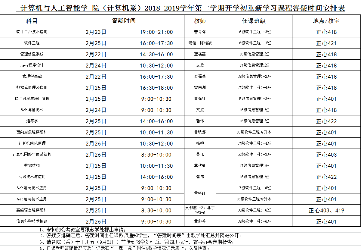 2018-2019学年第二学期<计算机与人工智能学院>课程答疑时间安排表