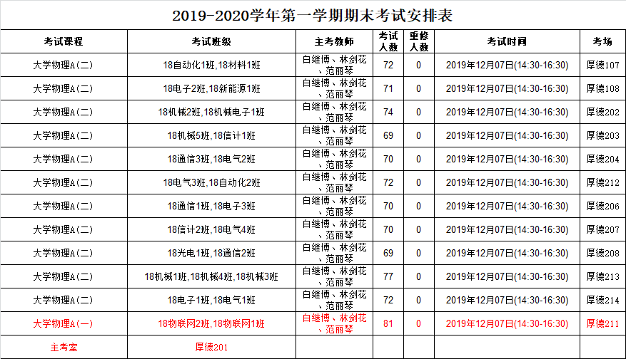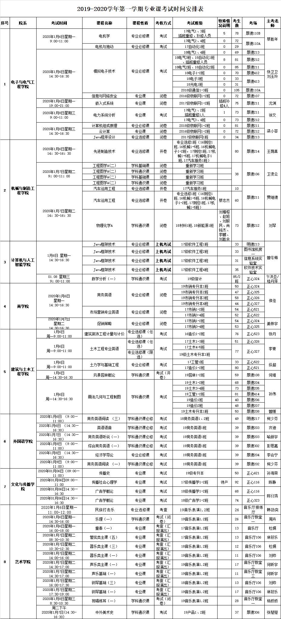 2019-2020学年第一学期第十八周专业课考试时间安排表