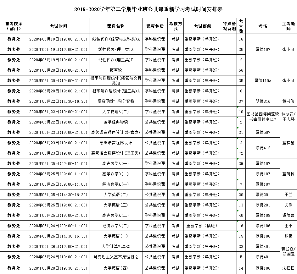 2019-2020学年第二学期毕业班公共课重新学习考试时间安排表