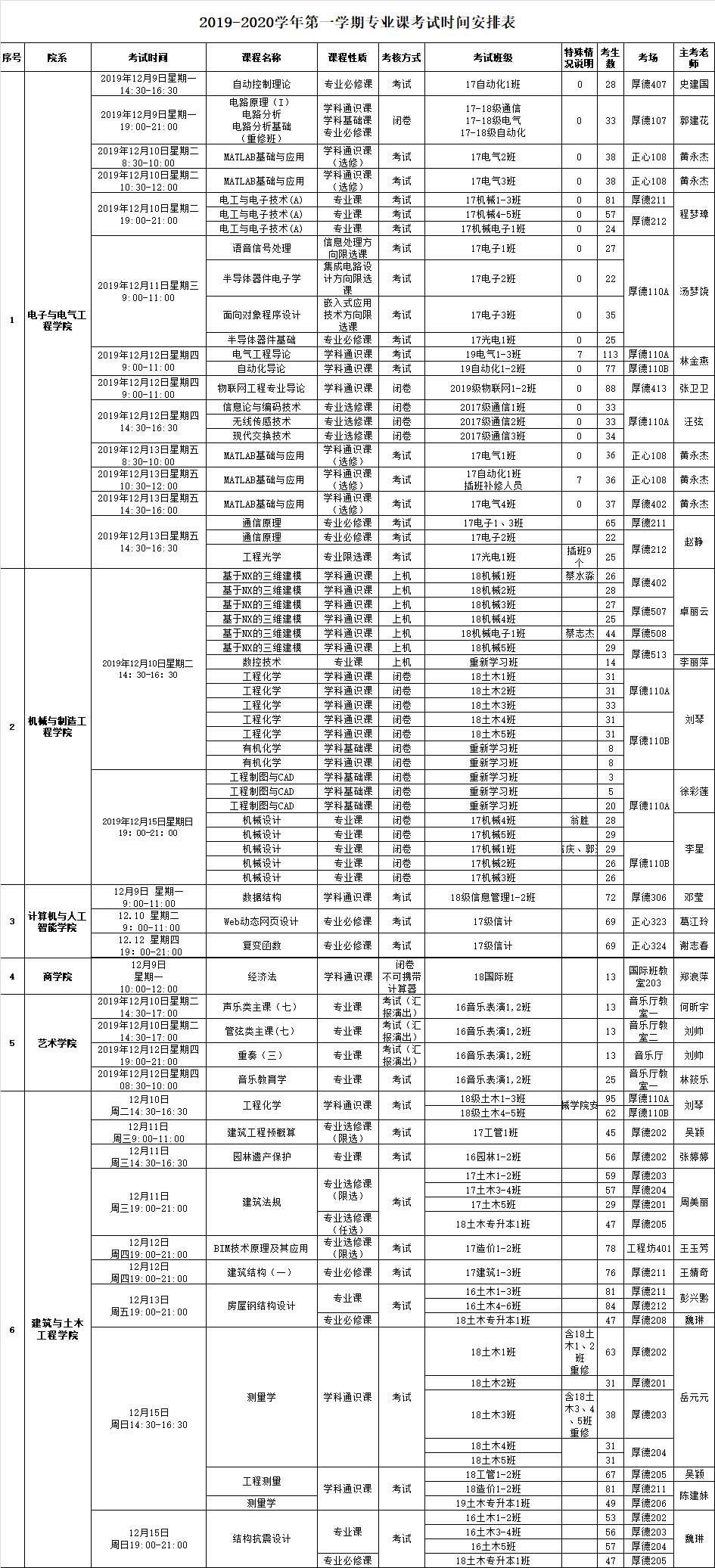 2019-2020学年第一学期第十五周专业课考试时间安排表