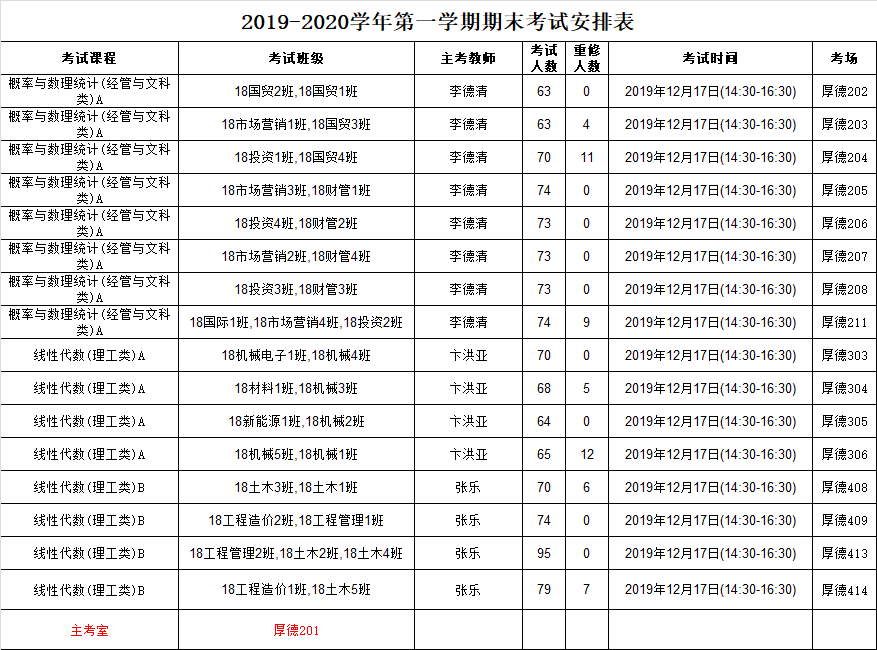 2019-2020学年第二学期公共课期初第一次重新学习(补考)时间安排表